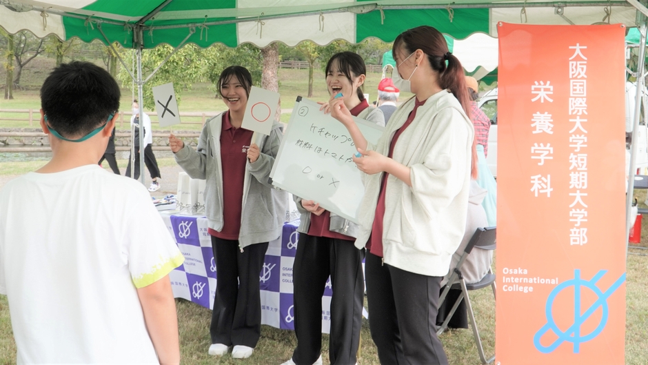 大阪国際大学短期大学部(大阪府守口市、学長 宮本郁夫)栄養学科の学生(1年生4名)が「エンジョイフェスタinねやがわ」に参加しました。毎週、自分たちで意見を出し合い、クイズ形式で食育ゲームを企画して実践しました。