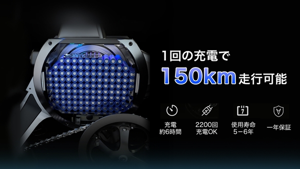 このバッテリーはたった1つ、一度の充電で150㎞走行可能。驚異的なロングアシストを実現いたしました。