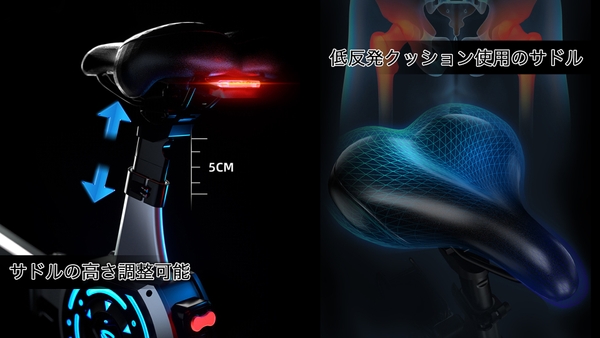 高さ調整可能なサドルは柔らかいクッションを使用しているので、長時間乗っても負担が少ないように設計しています。