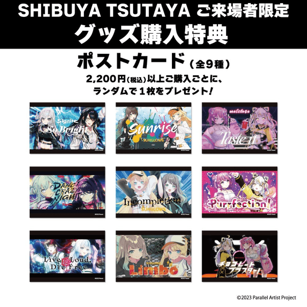 SHIBUYA TSUTAYA店頭限定で、対象商品を1会計2,200円(税込)以上ご購入ごとに、オリジナル特典「ポストカード(ランダム9種)」からランダムで1枚をプレゼントします。