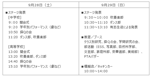 学年・クラス、部活動によるステージ発表や校内展示のほか、模擬店の出店や探究活動の研究発表を行います。また、令和6年(2024年)の世界大会で準優勝したダンス部や、吹奏楽部がステージでパフォーマンスを披露します。