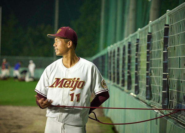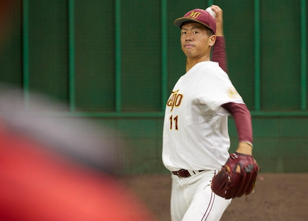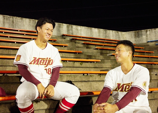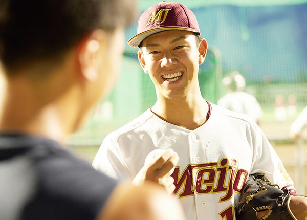 右投げ右打ちだが、本来は左ききで、箸もペンも左手で持つ。直球の回転数が2700回を超え、メディアを驚かせた。憧れの選手は、ニューヨークメッツで活躍し、“おばけフォーク”で名を馳せた千賀滉大投手。休日でも「野球から離れるのが怖いから」と、筋トレやランニングをしてしまうという。好対照をなす松本選手とともに名城大野球部を牽引し、いくつもの勝利に導いた。