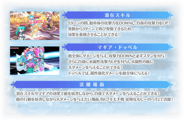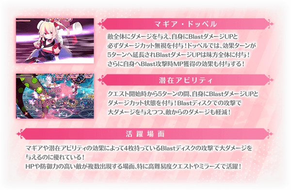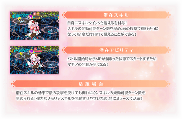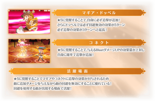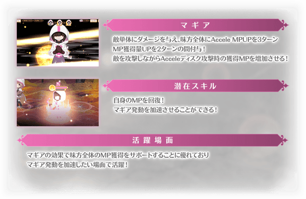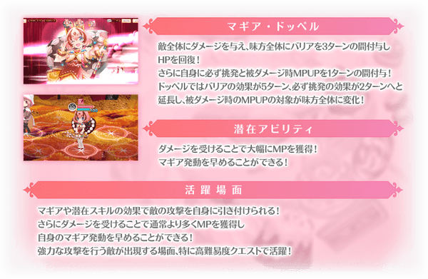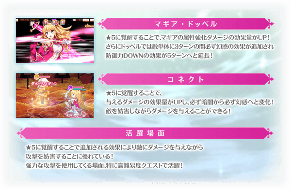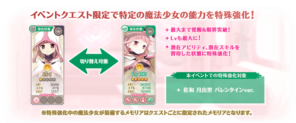 対象の魔法少女を編成して本イベントクエストをプレイする際にステータスを特殊な状態に強化することができます。
