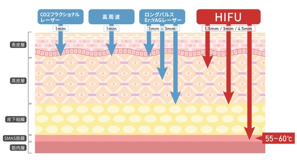 Gold Ultra Veraは業界初のHIFU(High Intensity Focused Ultrasound)を使用した腟縮小用医療機器です。腟内にハンドピースを挿入し、粘膜表面にダメージを与えることなく超音波が筋層まで到達する安全な治療となります。これまでの高周波やロングパルスエルビウムヤグレーザーは皮下組織までしか到達できなかったことと比べると、Gold Ultra Veraは、たるみの根本にアプローチできる最高峰マシンといえます。