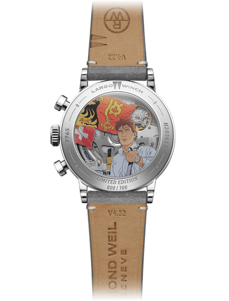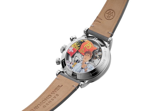 裏蓋のサファイアクリスタルには、フィリップ・フランクが本商品のために描き下ろした特別なイラストが描かれ、レイモンド ウェイルの本拠・ジュネーブの空気と「ラルゴ・ウィンチ」の世界観をともに感じることができます。スイス国旗とジュネーブ州旗が風になびき、100年以上の歴史を持つレマン湖汽船会社の大型外輪船がレマン湖を優雅に航行。ジュネーブの中心街と旧市街を結ぶモンブラン橋にて、『ミレジム』を携え、新たな冒険に旅立つラルゴの希望に満ちた表情が印象的です。