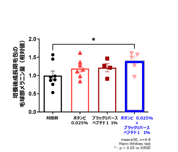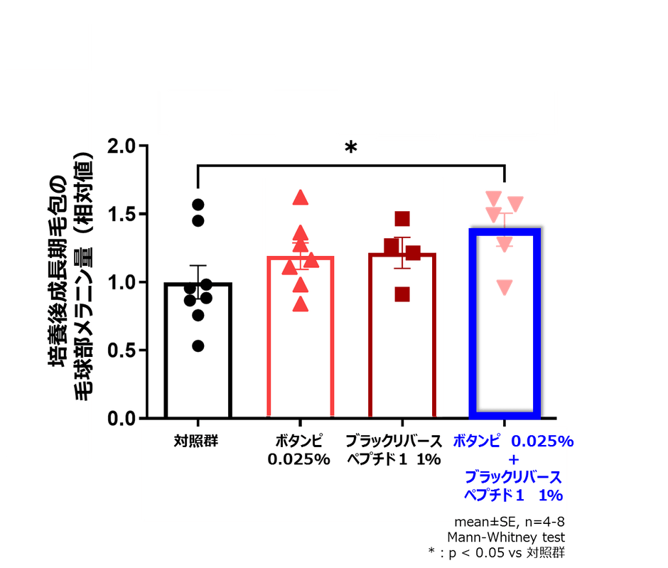 今回、「ボタンピエキス」の色素細胞でのMITOL発現上昇(図1)を、「ブラックリバースペプチド1」がさらに高めること(図5)、「MITOL活性化成分:ボタンピエキス」と「ブラックリバースペプチド1」を組み合わせることにより、毛包中でのメラニン含量(図2)が対照群と比較して有意に増加することを新たに見出しました(図6)。