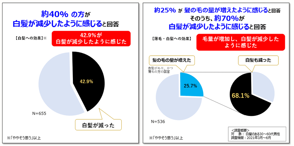 これらの細胞や培養組織で得られた知見を活用し、ホームユーステスト*3において生活者に「ボタンピエキス」×「ブラックリバースペプチド1」を使用いただいたところ、約40%の方に白髪が減少したように感じていただき、さらに、髪の毛の量が増えたように感じた方においては、約70%の方に白髪が減少したように感じていただけました(図7)。
