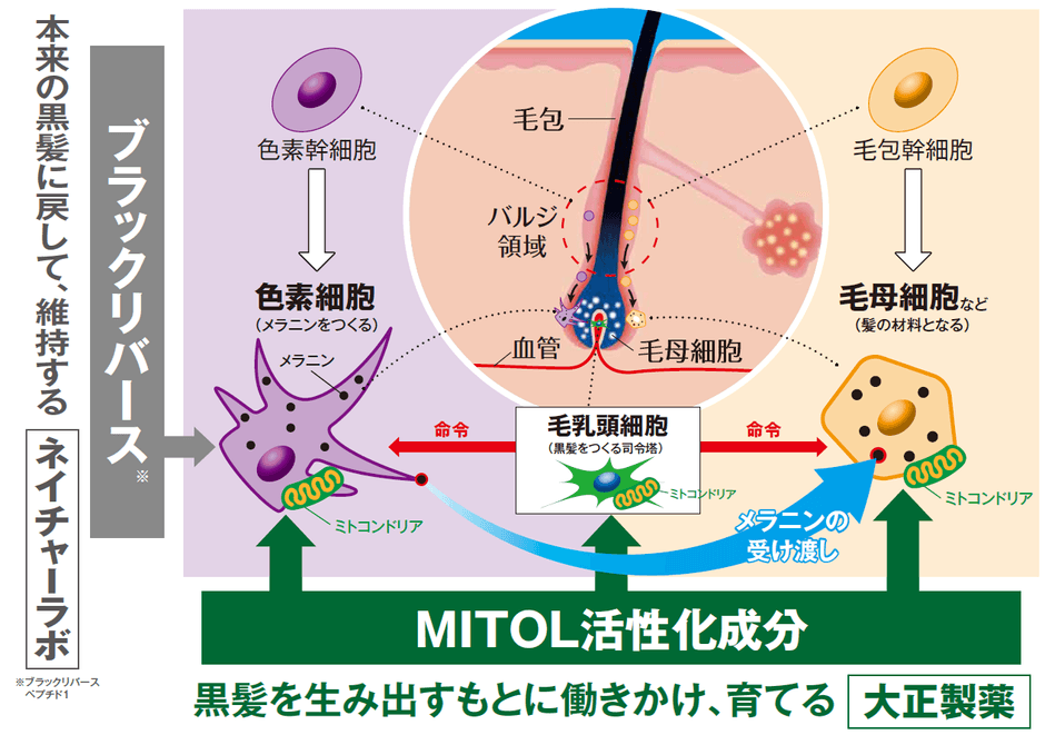 従来、大正製薬は「MITOL活性化成分:ボタンピエキス」の毛髪に対するアンチエイジング作用を研究してまいりましたが、この度、ネイチャーラボ社の「ブラックリバースペプチド1」を組み合わせることで、さらなる白髪への作用の可能性を見出しました。