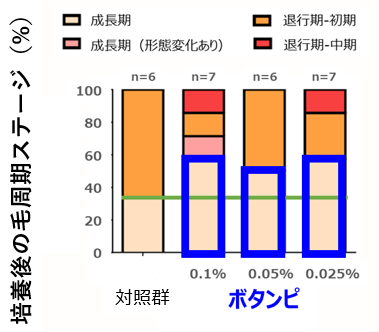 今回の研究で「MITOL活性化成分:ボタンピエキス」を培養毛包に添加したところ、「ボタンピエキス」がヘアサイクルの「成長期」を延長させることを新たに見出しました(図3、4)。