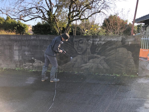 瀬戸口「地域おこし協力隊として指宿に移住してきて、昼間でも街が暗く見えると感じていました。その原因のひとつは建物の外壁が汚れているからだと思い至り、共感してくれたMOTORさんと二人で、最初は壁の清掃活動を始めました。」