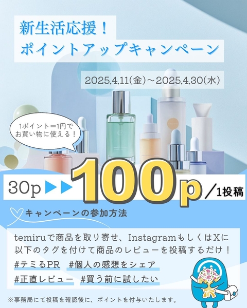 化粧品のお取り寄せサイトtemiru(テミル)は、SNS投稿でお買い物に使えるポイントプレゼントのキャンペーンを開始しました。期間中は、SNS投稿に応じてポイントが通常の3倍以上付与されます。