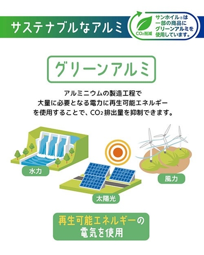 サンホイル®は一部の商品において、サステナブルなアルミ(グリーンアルミやリサイクルアルミ)を使用し、製造工程におけるCO2排出量の削減に取組んでいます。