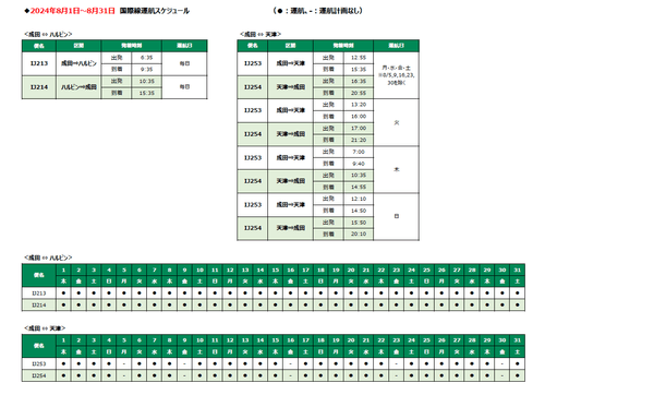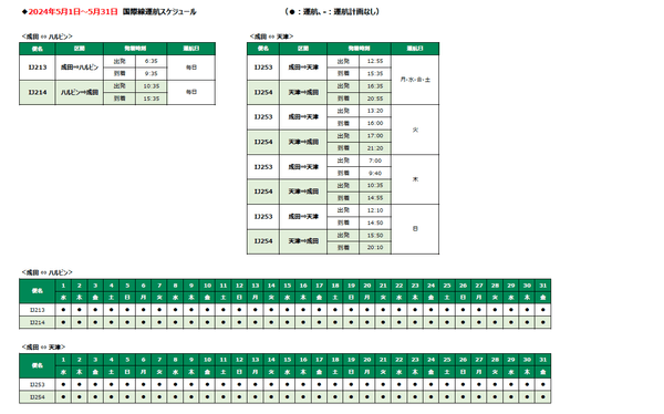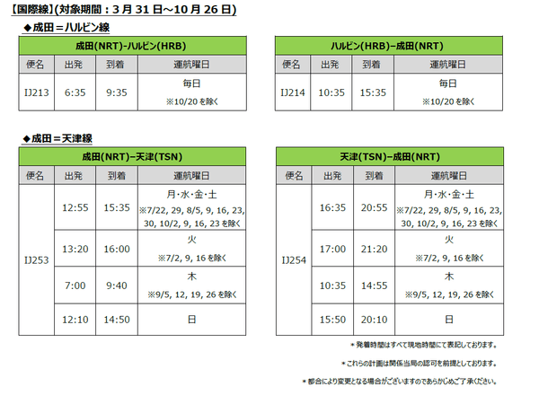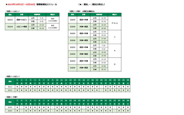 2024年1月26日 13:00JALグループのLCCであるスプリング・ジャパン株式会社(以下:スプリング・ジャパン)は、本日15時より、2024年3月31日(日)から10月26日(土)までの成田=ハルビン線および成田=天津線の販売を開始します。