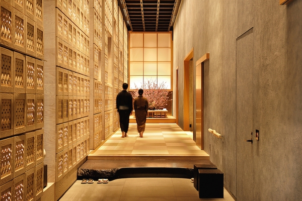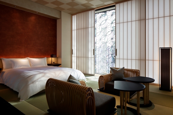 「塔の日本旅館」をコンセプトに2016年7月に開業。玄関で靴を脱ぎ、畳敷きの伝統的な和室や各階のお茶の間ラウンジ、最上階に温泉を備える星のや初の都市型旅館。