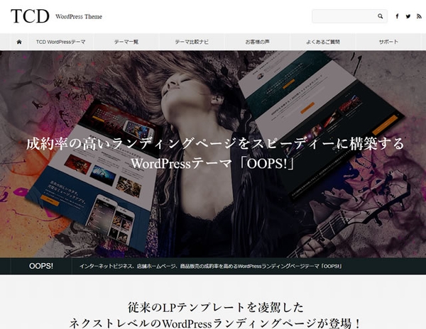 有料テーマで人気なのは、ワードプレステーマの国内シェアNO.1と言われているトップブランド「TCD」のテーマ「OOPS!」です。メーカーの詳細ページに詳しい記載がありますが、ランディングページがただつくれるというだけではなく、実に細かい設定まで、HTML、CSSの知識は必要ない形で感覚的に設定することができるのが特徴です。