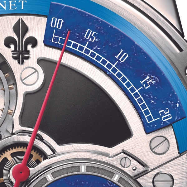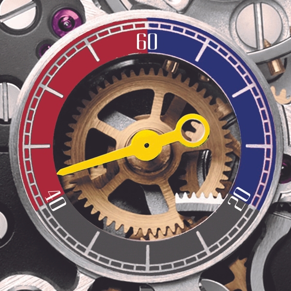 1秒1秒の経過をより際立たせ、「時間」の新しい価値を感じてもらうために、レトログラード機構を搭載しています。中央に配置しているレッドのレトログラード秒針は、20秒ごとに帰零。9時位置のスモールセコンドは、レトログラードの周期に対応して20秒ごとにブルー・ブラック・レッドに色分けされており、本来の秒針同様に60秒で1回転します。