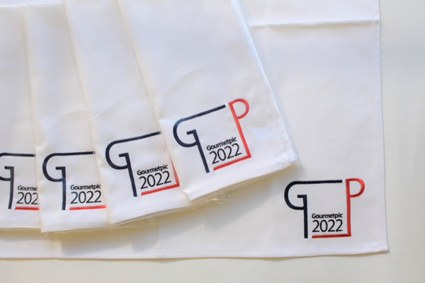 ロゴマークが右下に刺繍されたトーションを配布します。