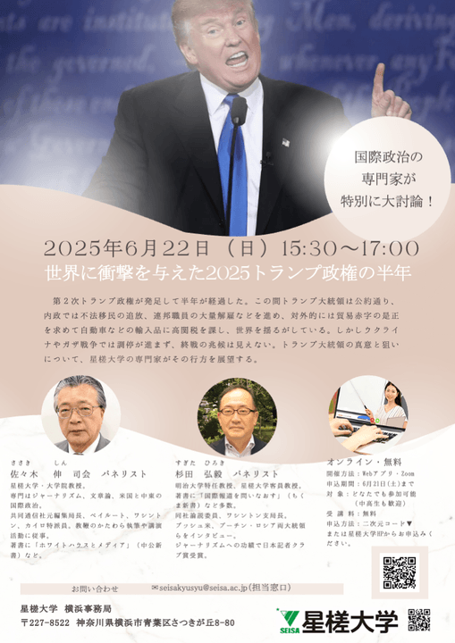 本講座では、世界を揺るがすトランプ大統領の真意と狙いについて、星槎大学国際問題研究所の専門家がその行方を展望します。