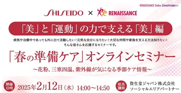 株式会社ルネサンス(本社:東京都墨田区、代表取締役社長執行役員:岡本 利治、以下「当社」)は、この度、2月4日のワールドキャンサーデーに合わせ、当社が取り組む「がん患者のQOLを高めるためのがん患者支援」の一環として、資生堂ジャパン株式会社(以下「資生堂」)が実施する「資生堂ライフクオリティー ビューティー活動」と連携し、2月12日にスキンケアや肌色の変化に応じたメイクに関する「春の準備ケアセミナー」を共催します。