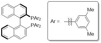※15 (R)-(+)-XylBINAP:下図のような構造をしている配位子。パラジウム触媒が中央の2個のリン(P)原子に配位することで、ポケットのような空間ができ、そこで化学反応が行われる。Ar基(ベンゼン環などから誘導される芳香族炭化水素)がPh基(ベンゼン環のこと)のものは、BINAP(2,2'-ビス(ジフェニルホスフィノ)-1,1'-ビナフチル)と呼ばれ、野依良治博士(平成13年(2001年)ノーベル化学賞受賞)らにより開発されている。