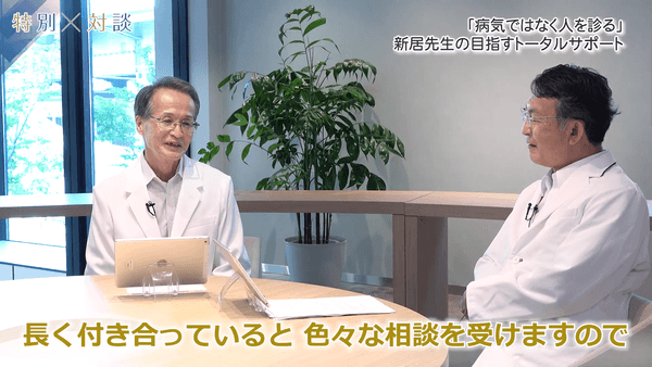 新居院長は、患者さんを「病気」ではなく「人」として診ることを重視し、体だけでなく心や社会的な側面にも配慮して診療していると語りました。長年通院している患者さんが通院困難になった際には往診を行い、急変時には医誠会国際総合病院が救急搬送を受け入れるなど、密接な協力体制が築かれています。