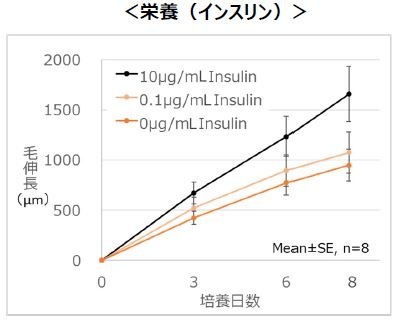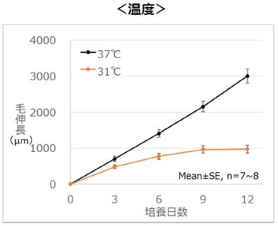 ヒト毛包組織を培養する新たな発毛評価法は、ヒトでの発毛候補化合物の効果を予測する上で有用な評価法と考えております。本研究にて、ヒト毛包器官培養の評価における培地中のホルモン濃度や栄養、紫外線照射だけでなく、酸素濃度や温度が毛の伸長に影響を及ぼすことが明らかになりました。