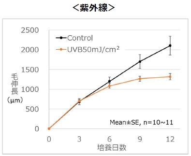 その結果、低酸素や低温、低栄養、また、紫外線照射や男性ホルモン添加により、毛の伸長が抑制されることが明らかとなりました(図2)。
