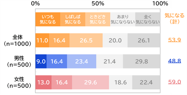 2024年4月のワキ汗・汗のにおいに関する意識調査(https://newscast.jp/news/7288570)によると、日常生活において、自分のワキ汗が気になると答えた人は男性では48.8%、女性では59.0%。
