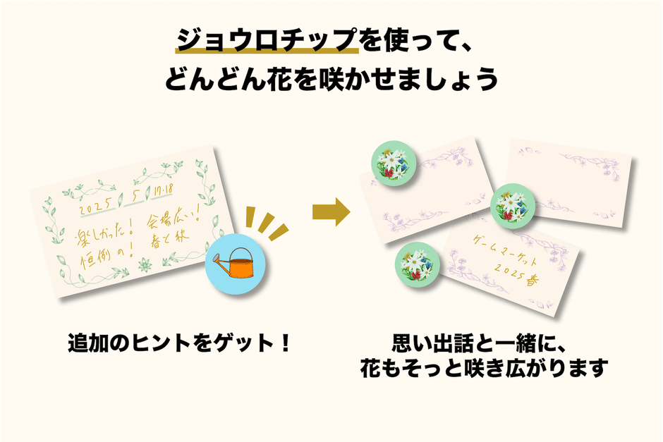 実際に遊んだときに、クイズの答えがわからない場合は「ジョウロチップ」を使って追加のヒントをもらうことができます。このチップを使うたびに花が咲いて、盤面も心も明るくなっていく仕掛けが施されています。