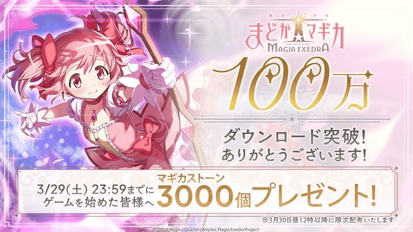 新作アプリゲーム『魔法少女まどか☆マギカ Magia Exedra』 100万ダウンロード突破!3月29日(土)23:59までにゲームを開始するとマギカストーン3,000個プレゼント!