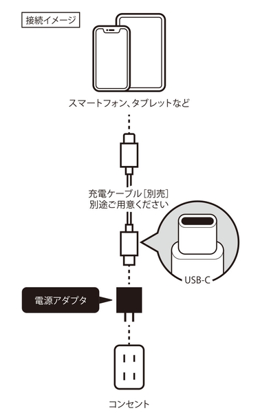 お手持ちのUSBケーブルとつないで様々な機器を家庭用コンセントから充電できるUSB-Cポート搭載の電源アダプタです。軽量26gのコンパクト設計でプラグも収納できる為、持ち運びに便利なデザイン。1.5A出力で通電時にLEDランプが点灯します。また海外対応※100V~240Vなので旅行先でも使用できます。※別途変換プラグが必要となる場合があります。海外での使用は保証対象外となります。