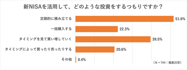 「新NISAを活用して、どのような投資をするつもりですか?」という質問に対して、「定期的に積み立てる」と回答した人は、およそ半数の51.6%でした(複数回答)。世間的には「NISAと言えば積み立て」といったイメージもありますが、半数の人は、現時点では積み立てを考えていないということになります。