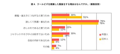 クールビズを意識した服装をする理由としては、「涼しくて快適・楽なため(79%)」と実用性を重視している方が多いようです。また日本人の回答と比較すると、外国人は「おしゃれであると思うため(22%)」「ジャケットやネクタイは好きではないため(30%)」と、日本人よりもファッション性を加味して服装を選んでいるということもわかりました。また、「節電・省エネにつながると思うため(30%)」は日本人よりも比率が小さく、環境のためにクールビズを実施しているという意識は低いのかもしれません。