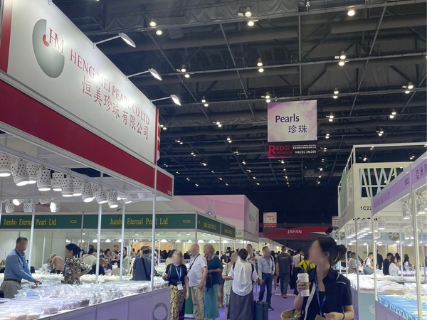『ジュエリー&ジェムワールド香港2023』に出展 オープン前から行列ができ、連日ショーケース前のスペースが埋まるほどの賑わいに 養殖に必要な貝の大量死で通常の半分程度に減少したパールの需要が高まる傾向も