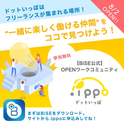 仕事用コミュニケーションアプリ(スマートフォンアプリ)「BiSE(バイス)」を提供する合同会社KBC(神奈川県川崎市 代表社員 小林慶志郎)は、フリーランスや副業で“一緒に楽しく働く仲間”を見つけるための無料オープンコミュニティ「.ippo(ドットいっぽ)」の8月2日のスタートに向けて、参加メンバーの募集を行っています。