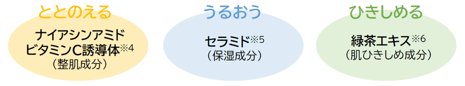 ※1 つけた瞬間の感触※2 シリカ(粉体基剤)※3整肌成分※4 アスコルビルグルコシド※5セラミドNP、セラミドNG、セラミドAP※6チャ葉エキス