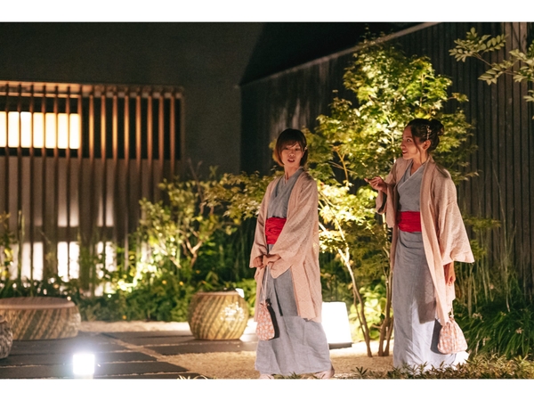お花見の気分をより高めるために、界オリジナルの麻浴衣に合わせ、春らしい色合いの「夜桜ころもセット」を用意します。このセットに含まれる足袋、草履、帯、巾着、長羽織着飾り、夜の温泉街へ出掛ければ、より一層ワクワクした気持ちで夜桜を楽しめ、写真映えも間違いなしです。