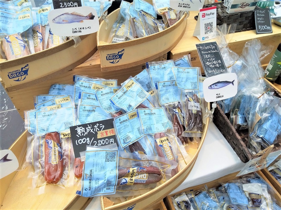 北海道の応援ブースでは北海道の海の幸・山の幸がならび、新鮮な無農薬野菜、種類豊富なシフォンケーキ、新潟魚沼の新米コシヒカリや、スペインのカラスミもマグロやマルーカなど、なかなか他では見かけない種類も。