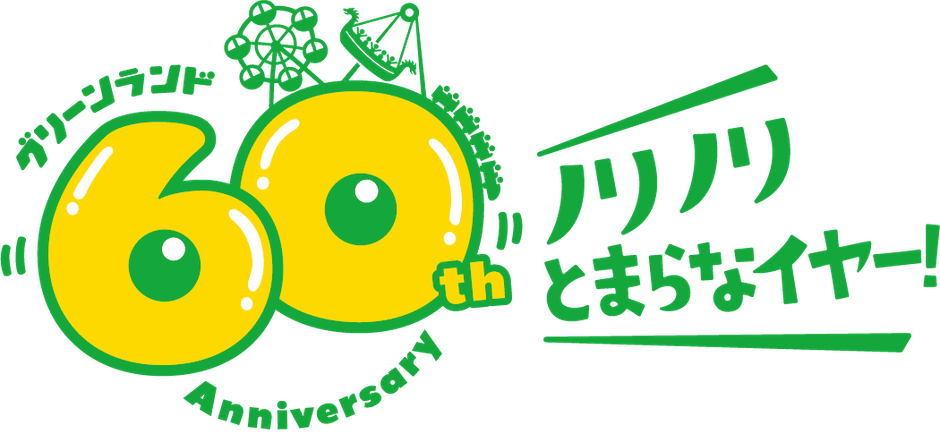 60周年記念ロゴは「60」と「Anniversary」の文字が笑顔を形作るビジュアルに仕上がっており、開園当時は観光果樹園としてオープンしたグリーンランドを象徴する、実りある光沢感を演出しております。