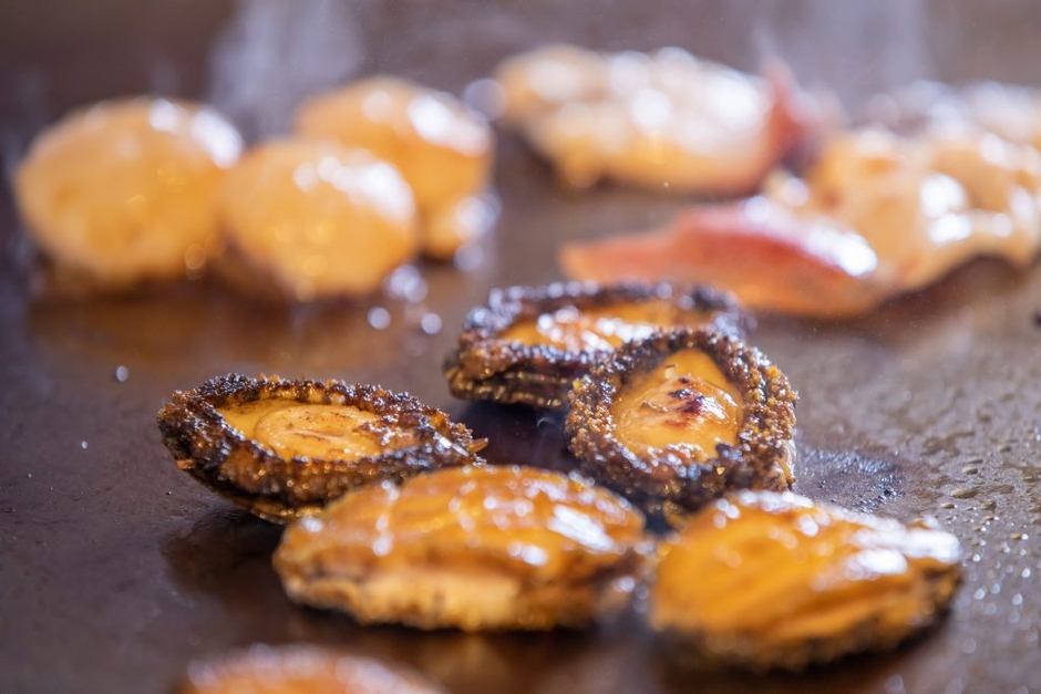 鉄板焼きで提供する貝は、冬に旬を迎えるアワビやホッキ貝、北海道が水揚げ量全国1位(*1)を誇るホタテの貝柱の3種です。北海道で獲れるアワビは、コリコリとした食感や豊かな磯の香りが特徴です。ホッキ貝は春の産卵期に備え、冬に栄養分や脂を蓄えます。軽く熱を加えることで、食感がさらに良くなり、旨味が増します。また、ホタテの貝柱は肉厚でしっかりとした歯ごたえが特徴です。焼き上げることで味わいが凝縮され、コクや甘みがより強くなります。これらの鉄板焼きに合わせるのはガーリックオイルで、豊かな風味が貝の旨味をより一層引き立たせます。