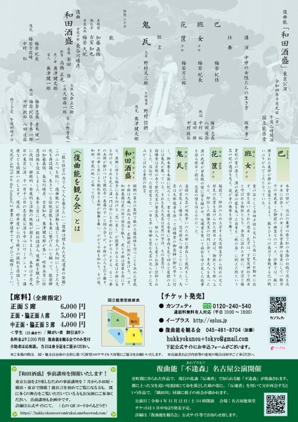 本年は10月9日の東京公演、11月12日の名古屋公演を軸に、能狂言の講座なども開催します。昨年度より引き続き、文化庁ARTS for the future!事業の採択を目指しています。