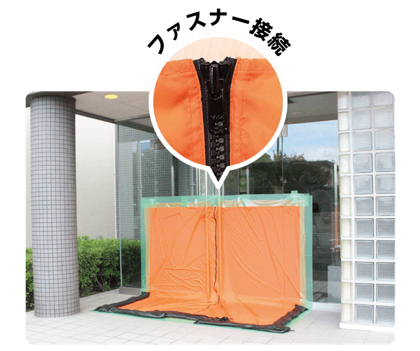 当商品は、止水シートのパーツをファスナー接続で横幅を延長、建物に合わせて自由に設置できます。