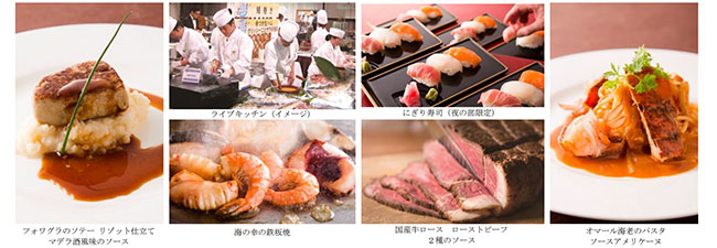 イメージ写真ダイナミックなパフォーマンスや、できたての料理が楽しめるシェフ実演コーナー「ライブキッチン」ではフォワグラのソテーやオマール海老のパスタ、揚げたて天ぷら、にぎり寿司など世界のグルメをイメージした多彩な料理が食べ放題でお楽しみいただけます。