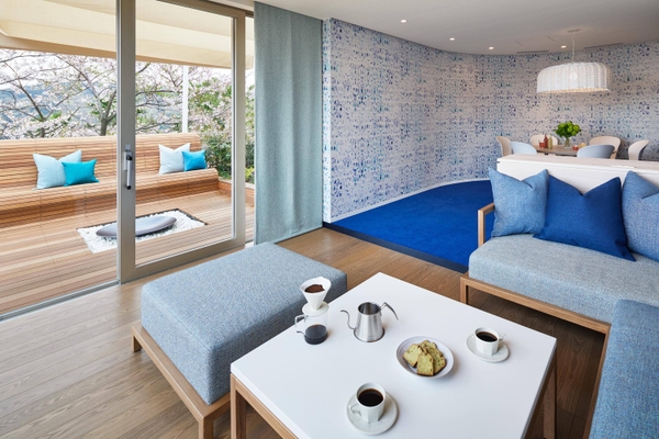 テラスリビングコーナーは、リゾナーレ熱海で最も桜が綺麗に見える137.5平米の客室です。山の斜面に沿って建っているので、部屋の高さが枝先と同じ高さにあります。そのため、相模湾を一望できる28.5平米のテラスからは、海と桜が同時に視界に入り、相模湾の青色と桜のピンク色が織りなす景色を楽しむことができます。