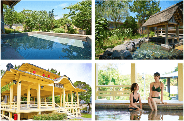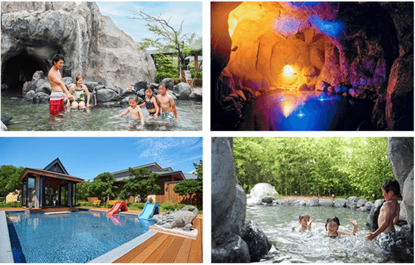 写真左上から時計回りに、「大滝の湯」、「青の洞窟」、「竹林の湯」、「亜細亜の湯」