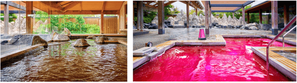 写真右:露天風呂、一番人気は「コラーゲンの湯」。とろりとした湯と甘い香りが男女問わず人気のお風呂です。