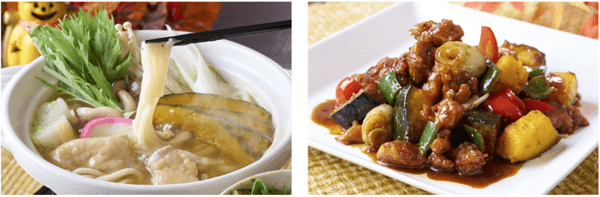 写真左:和食処<千寿樓>のハロウィン限定メニュー、「具だくさんかぼちゃの煮込みうどん(1,078円)」