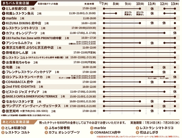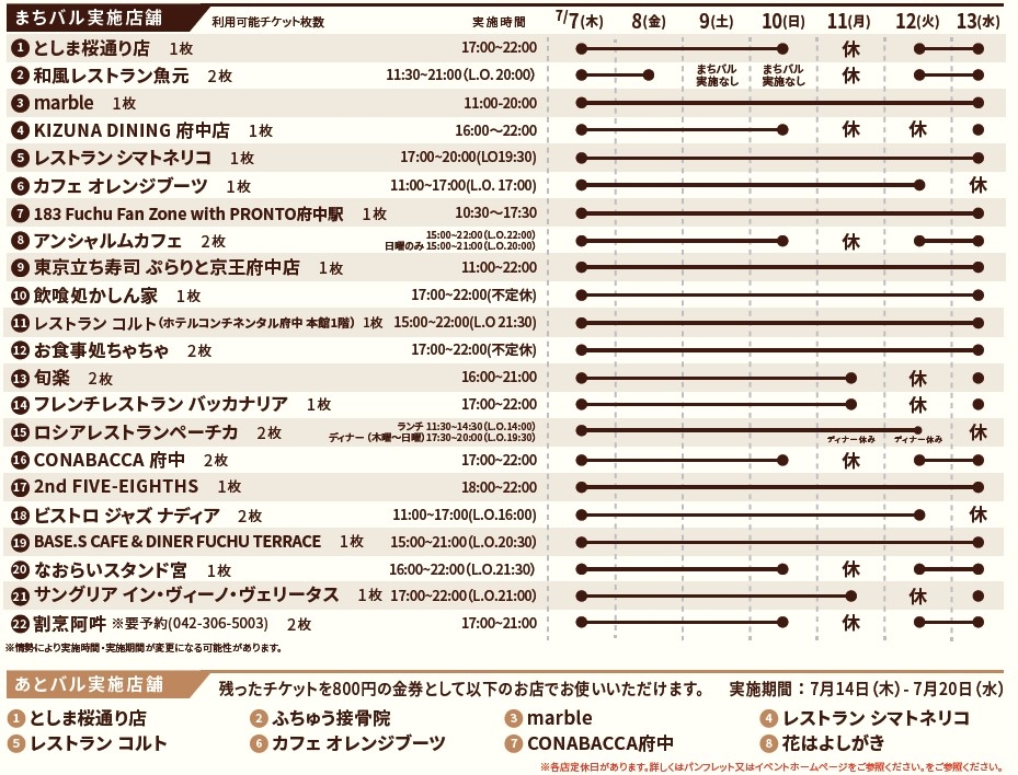 また、まちバル期間終了後にチケットが全部使い切れなかったお客様を対象に「あとバル」として、「あとバル実施店」の飲食店/小売店/サービス店などにチケットをお持ちいただくことで、金券としてご利用いただけます。