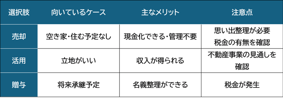 これが整理できていれば、「売る」「貸す」「残す」「引き継ぐ」すべての選択肢を現実的に検討できるようになります。
