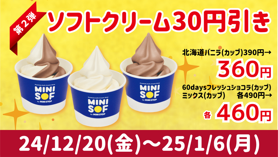 <対象のソフトクリーム30円引き> セール期間:2024年12月20日(金)~2025年1月6日(月)